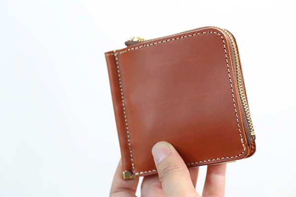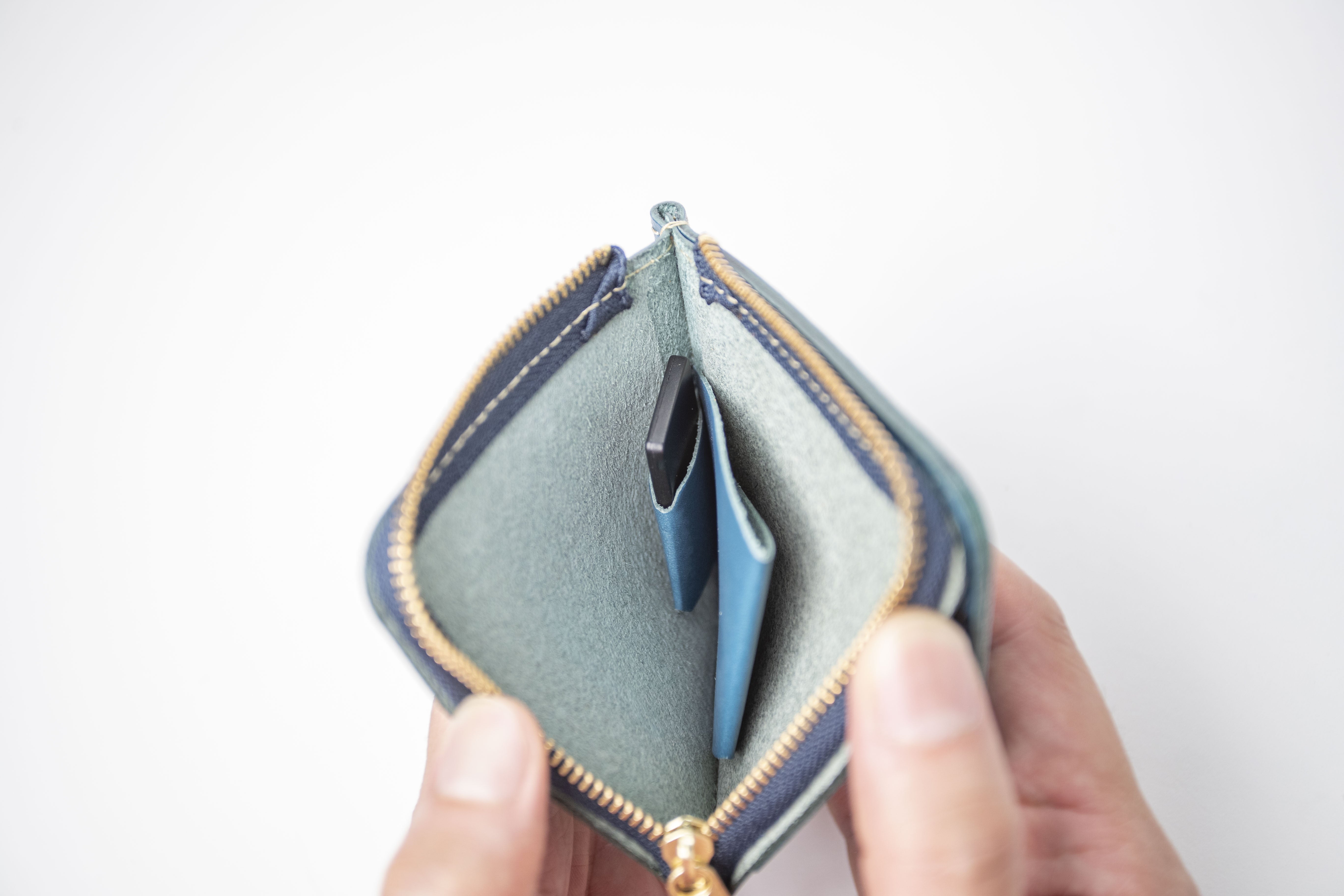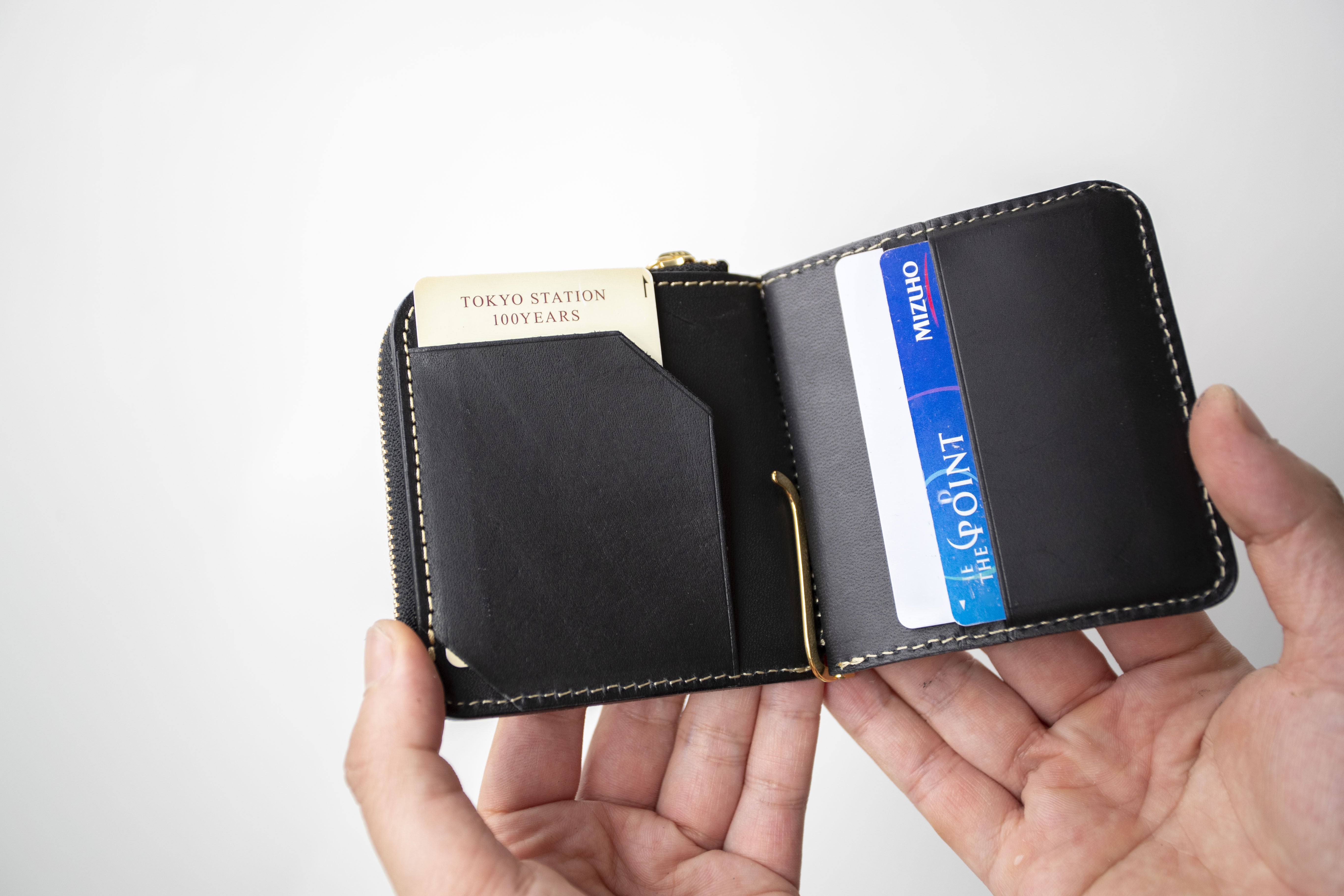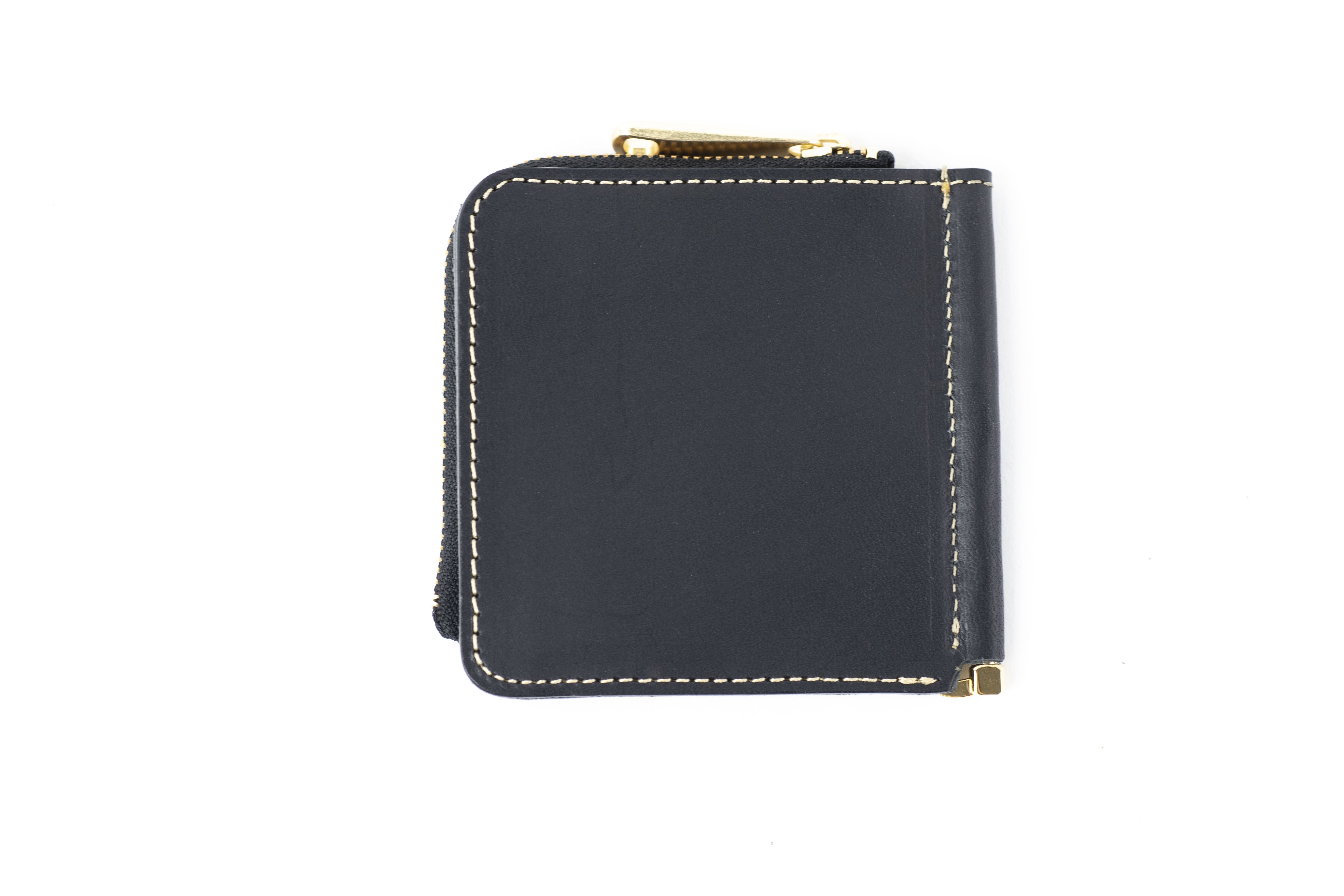 マネークリップタイプのお財布は小銭入れのないものが多いのですが、使いやすいL字ファスナーの小銭入れスペースを作ったので小銭もたくさん入ります。