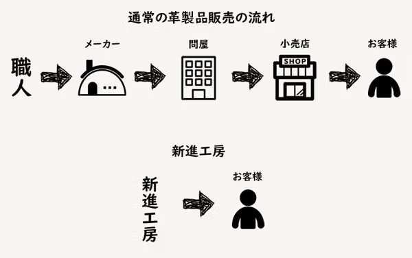 お客様の手に届くまでに多くの中間マージンや物流コストが発生しています。それに比べて新進工房の仕組みはシンプルです。
