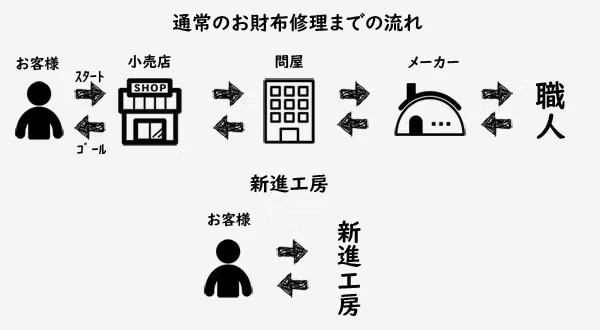 革製品の修理の流れは先ほどと逆の流れになるので修理までに時間がかかり、間に多くの人が介在するので無料で修理を受けていないところが多いのが実状です。新進工房はお客様との間に人が介在しないので通常の流れに比べて修理の時間が短くできます。無料でお受けするのは簡単なことではございませんが、一生懸命作った革製品を長く気持ちよく使っていただきたいとの一心で新進工房では、無料で修理を受けさせていただいております!保証内容につきましてご不明点などございましたらお気軽にご連絡くださいませ。