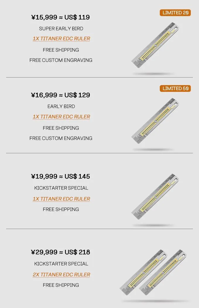2022/09/20 11:34「Titaner チタンEDC定規「Ruler- the Mix」」プロジェクトオーナーのSUZUKI1008です。この度はご支援いただきまして誠にありがとうございます。ご支援されたリターンの発送手続きを進んでまいります、ご報告させていただきます。リターンがお手元に届くまで、今しばらくお待ちくださいませ。カスタム彫刻につきまして、備考欄に記入致しました内容で彫刻させていただきます。なしをご記入いただいたご支援者様のリターンには彫刻なしでの手配をさせていただきます。間違いないように再度のご確認をいただければ幸いです。改めて、ご支援いただきまして誠にありがとうございます。今後とも、どうぞよろしくお願いいたします。 もっと見る