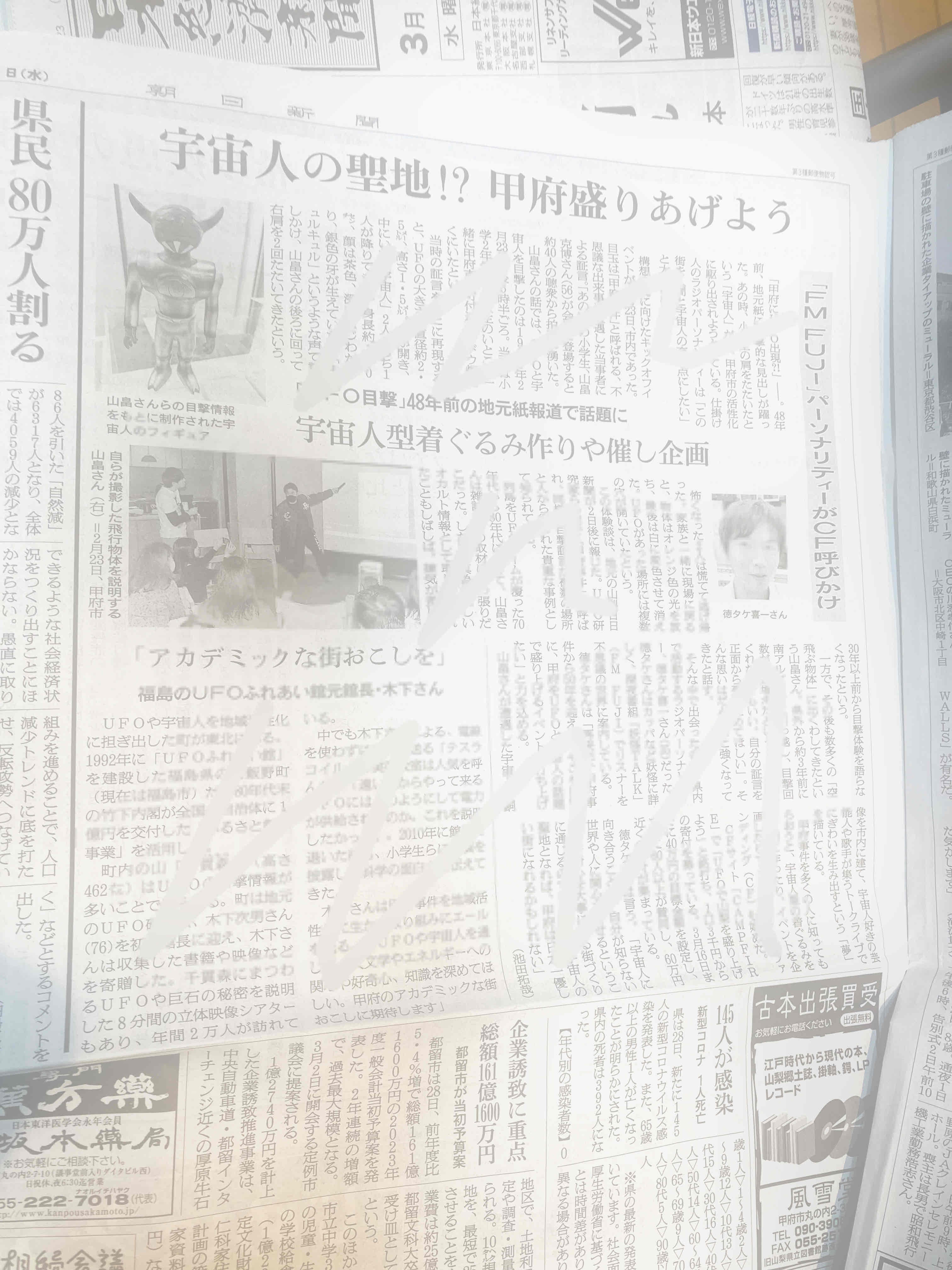 このたび、山梨の不思議遺産を活用し、地域の活性化&甲府UFO事件と楽しく親しむ!プロジェクト
