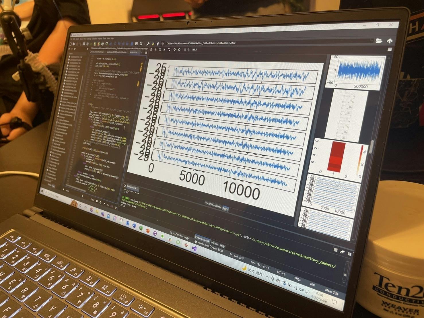 武藤の脳波が音にどのように反応しているかをあらゆるパターンで計測することで、より正確なデータを集め、議論を重ねています。
