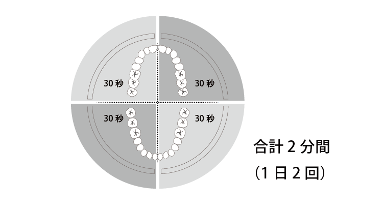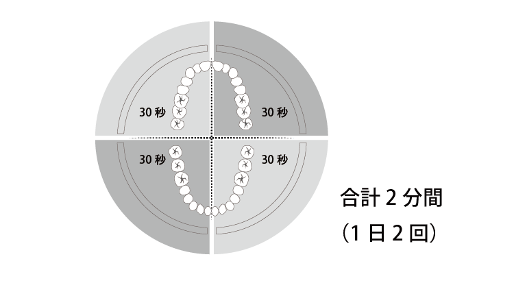 歯全体を優しくブラッシング。30秒ごとに振動が一時停止します。1度の使用で計2分間のブラッシングタイマーが搭載されています。