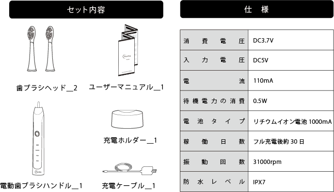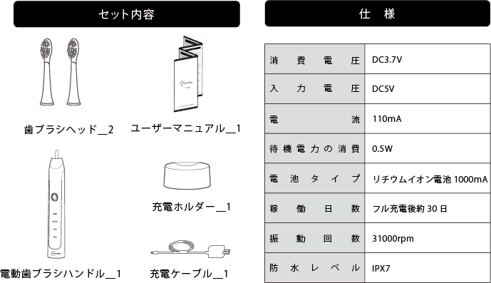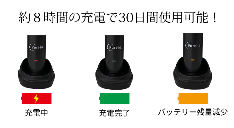 煩わしいコードはハブラシについておりません。充電器に置くだけで充電が完了します。さらに、約8時間の充電で30日間使用ができます。