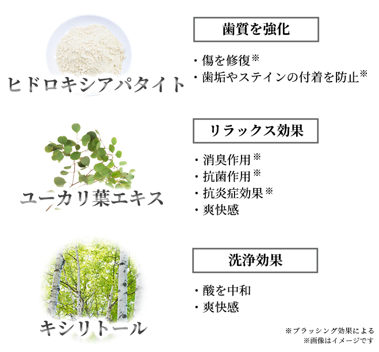 水(基剤)、PG(湿潤剤)、PEG-60 水添ヒマシ油(可溶化剤)、ヒドロキシアパタイト(清掃剤)、キシリトール(甘味剤)、酸化タングステン(清掃剤)、酸化チタン(清掃剤)、ユーカリ葉エキス(湿潤剤)、ホスホリルオリゴ糖Ca(湿潤剤)、パール(清掃剤)、サピンヅストリホリアツス果実エキス(洗浄剤)、グリチルリチン酸2K(甘味剤)、三リン酸5Na(清掃剤)、リンゴ酸(洗浄剤)、ハイドロゲンジメチコン(清掃剤)、キサンタムガム(粘結剤)、PEG-400(清掃助剤)、コカミドプロピルベタイン(洗浄剤)、フェノキシエタノール(可溶化剤)、エタノール(清涼剤)、香料(着香剤)、メチルパラベン(保存剤)