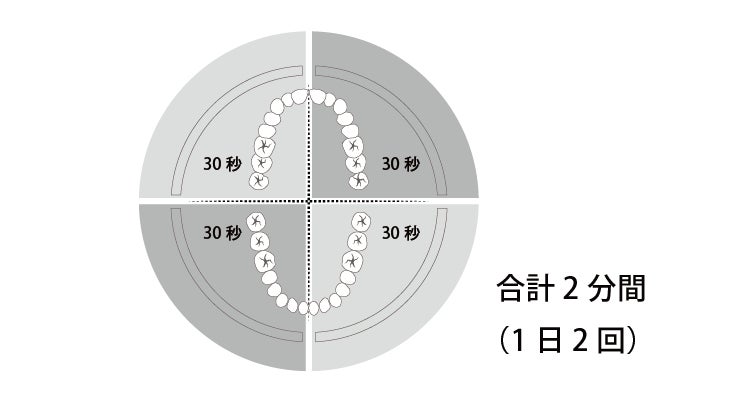 歯全体を優しくブラッシング。30秒ごとに振動が一時停止します。1度の使用で計2分間のブラッシングタイマーが搭載されています。