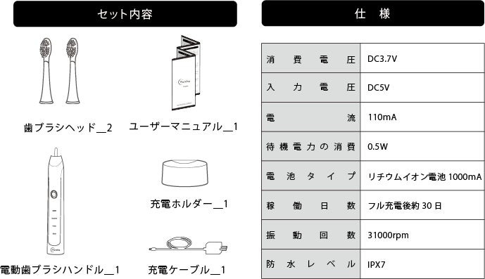 煩わしいコードはハブラシについておりません。充電器に置くだけで充電が完了します。さらに、約8時間の充電で30日間使用ができます。
