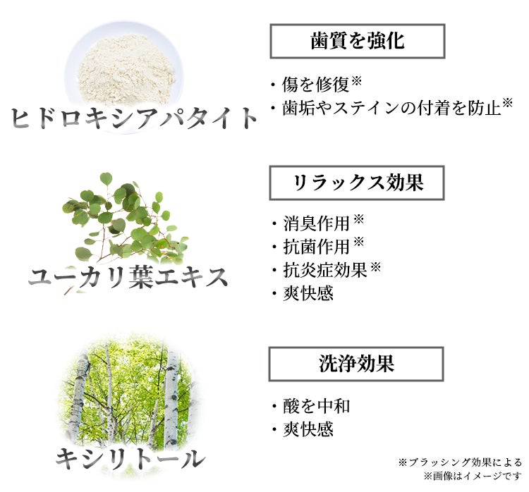 特にユーカリ葉エキスは万能で口腔環境を衛生的に保つ効能はもちろんですが、リラックス効果や心の安らぎにも作用します。