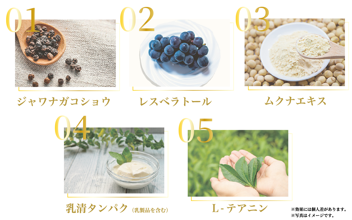 Β-ニコチンアミドモノヌクレオチド(国内製造)、乳清たんぱく、ムクナエキス末、ヒハツ末、赤ワインエキス末/HPMC、結晶セルロース、ステアリン酸カルシウム、L-テアニン、微粒二酸化ケイ素(一部に乳成分を含む)