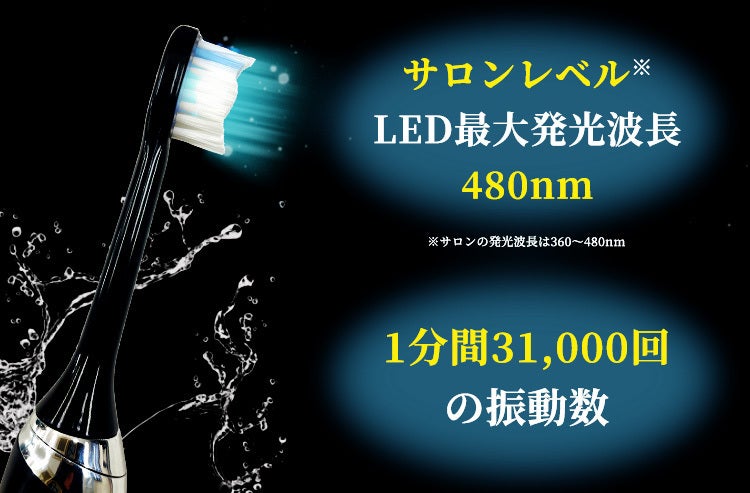 ホワイトニングサロンの発光波長は360〜480nm。今回、ピュアハ限定モデルの最大発光波長は480nm。これはサロンに劣らないレベルです。限定モデルの振動数は1分間に31,000回をも誇ります。