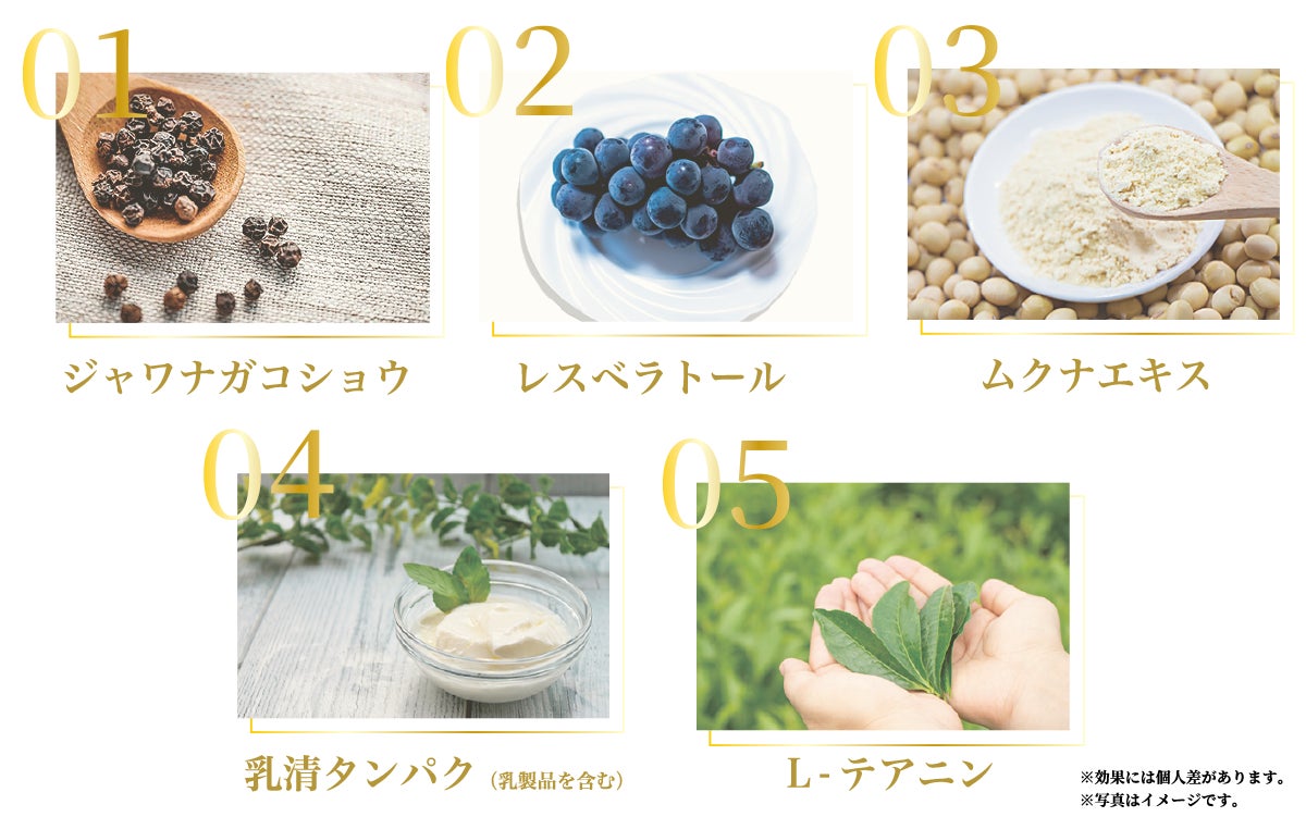 Β-ニコチンアミドモノヌクレオチド(国内製造)、乳清たんぱく、ムクナエキス末、ヒハツ末、赤ワインエキス末/HPMC、結晶セルロース、ステアリン酸カルシウム、L-テアニン、微粒二酸化ケイ素(一部に乳成分を含む)