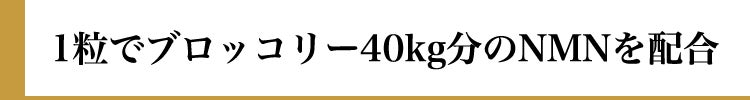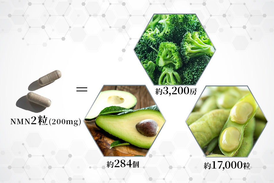 当社のNMNサプリは1粒に100㎎のNMNが配合されています。NMNはブロッコリーや枝豆、アボカドから摂取可能ですが、その量はごく微少です。食事で100㎎のNMNを摂取しようとすると、ブロッコリーを40㎏摂取しなければならないので、上手にサプリメントで補うことが効果的です。