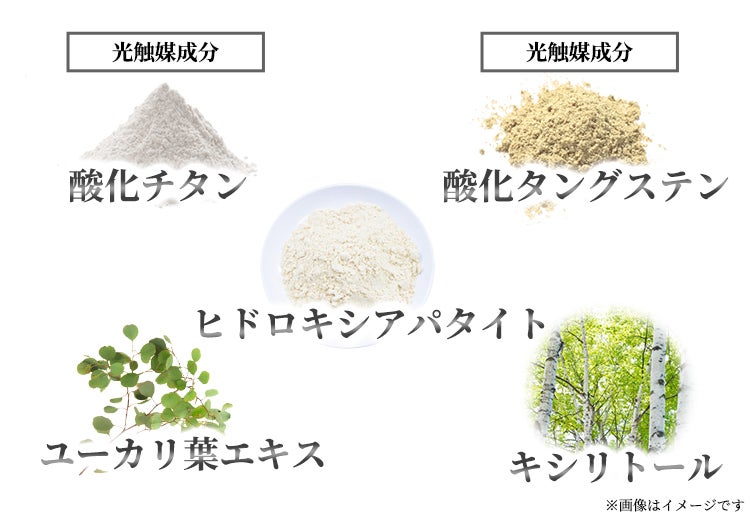 ピュアハ ハミガキ粉は何度も試作を重ね、独自の手法で光触媒成分を配合し、開発しました。下記以外にも、歯茎の健康を促進する、褐藻エキス(沖縄水雲から抽出したフコイダン)など、様々な成分が配合されています。