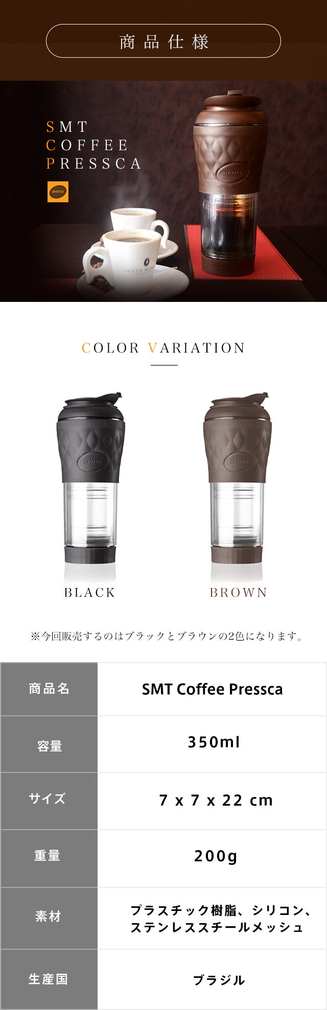 【SMT Coffee Pressca】はコーヒーの本場ブラジル生まれのフレンチプレス器内蔵の携帯タンブラーです。