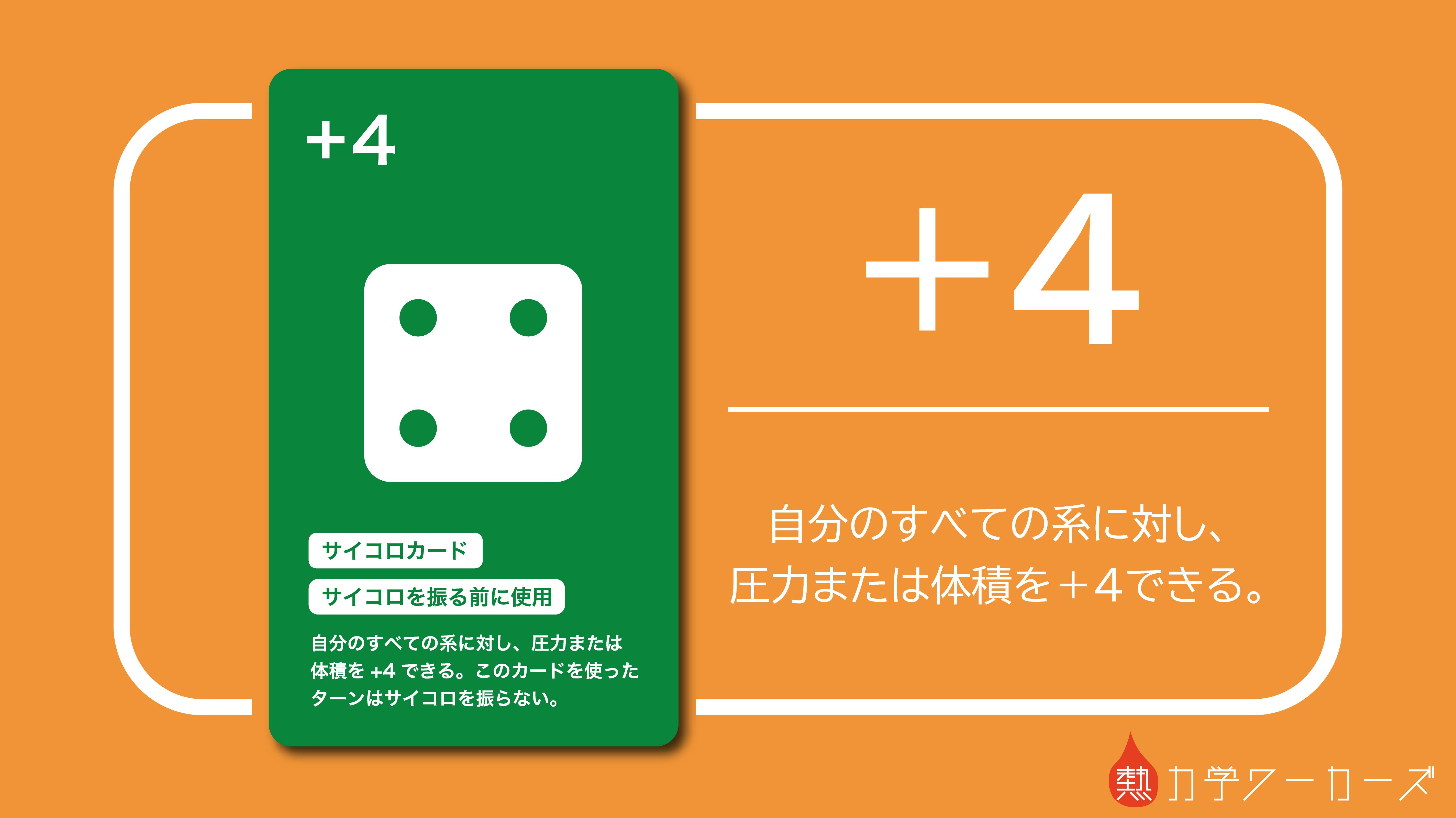 今回紹介するのは【+4】です!サイコロを振る代わりにすべての系を等積方向 or 等圧方向に+4進める強力なカード!熱力学ワーカーズで用いるサイコロは特殊で、目が +1 〜 +3 までの3つしかないことから、このカードの強力さが伝わりますでしょうか…!