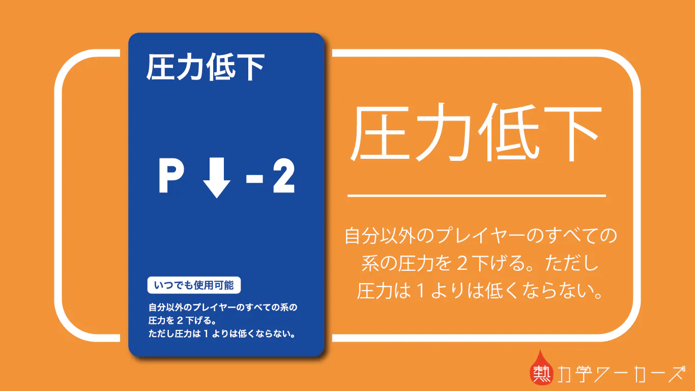 今回紹介するのは【圧力低下】です!このカードを使うと、ボードにある相手全員の全ての系の圧力を2つ下げることができます。圧力が低下した系は発生させることのできる仕事も小さくなるので、相手全員の打点を下げることができる強力なカードです!相手が系をより多くボードにおいている状態でこのカードを使うと効果大です!
