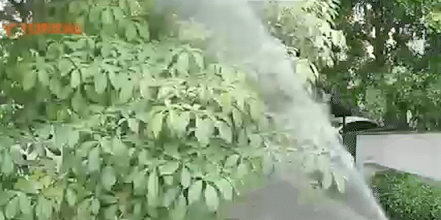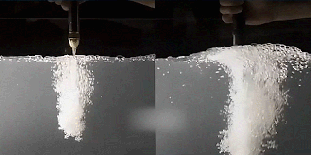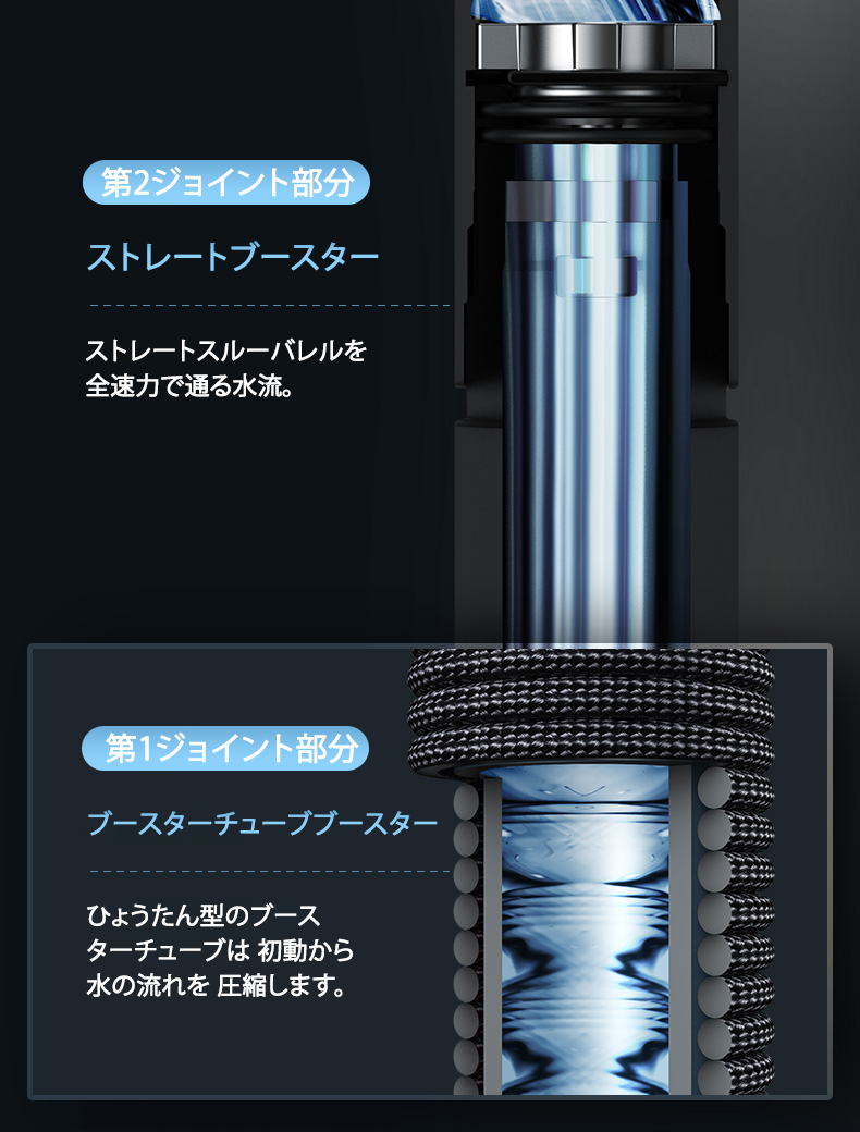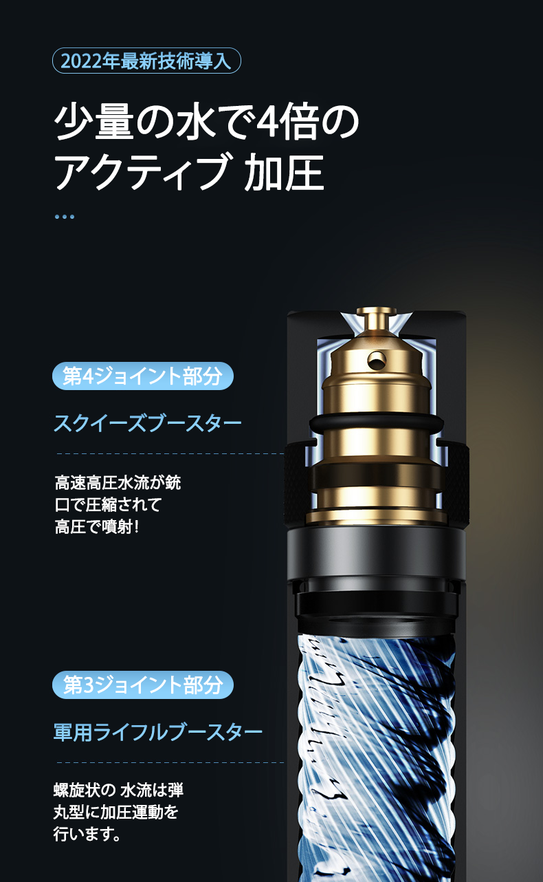ホース内に流れる水に旋回運動を与えて加速させ、水流は渦を巻きつつ圧力も増していきます。