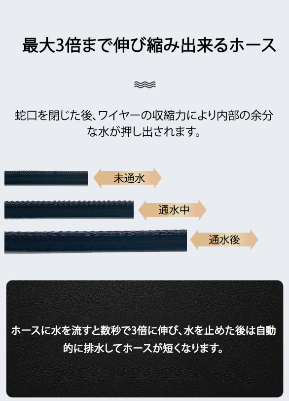 ホースの基本長さ:5メートル(通水後15メートル)ー 10メ-トル(通水後30メートル)