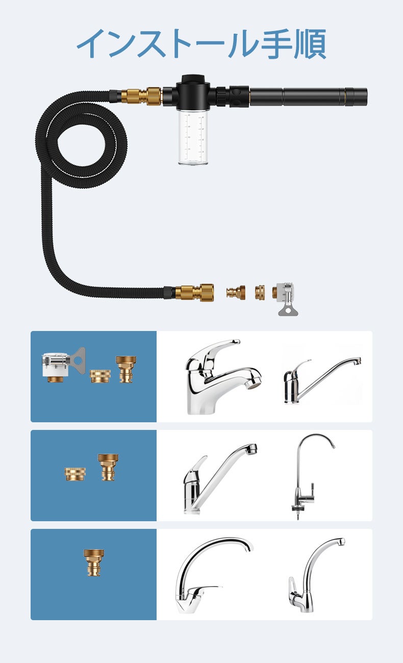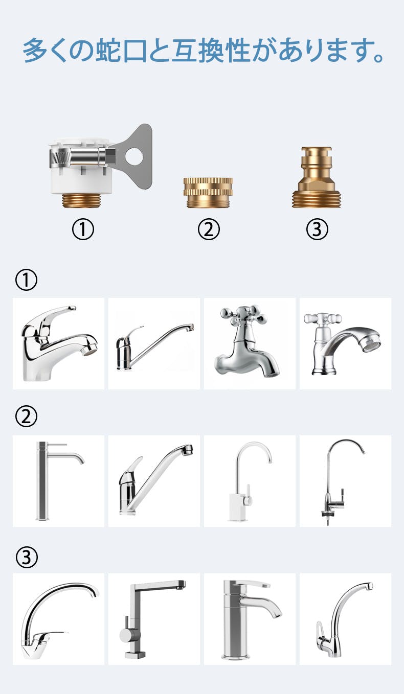 蛇口の形状とあわせてニップルの組み合わせを選んで蛇口にニップルを取り付け、そしてコネクターのついたホースをワンタッチで接続できます。