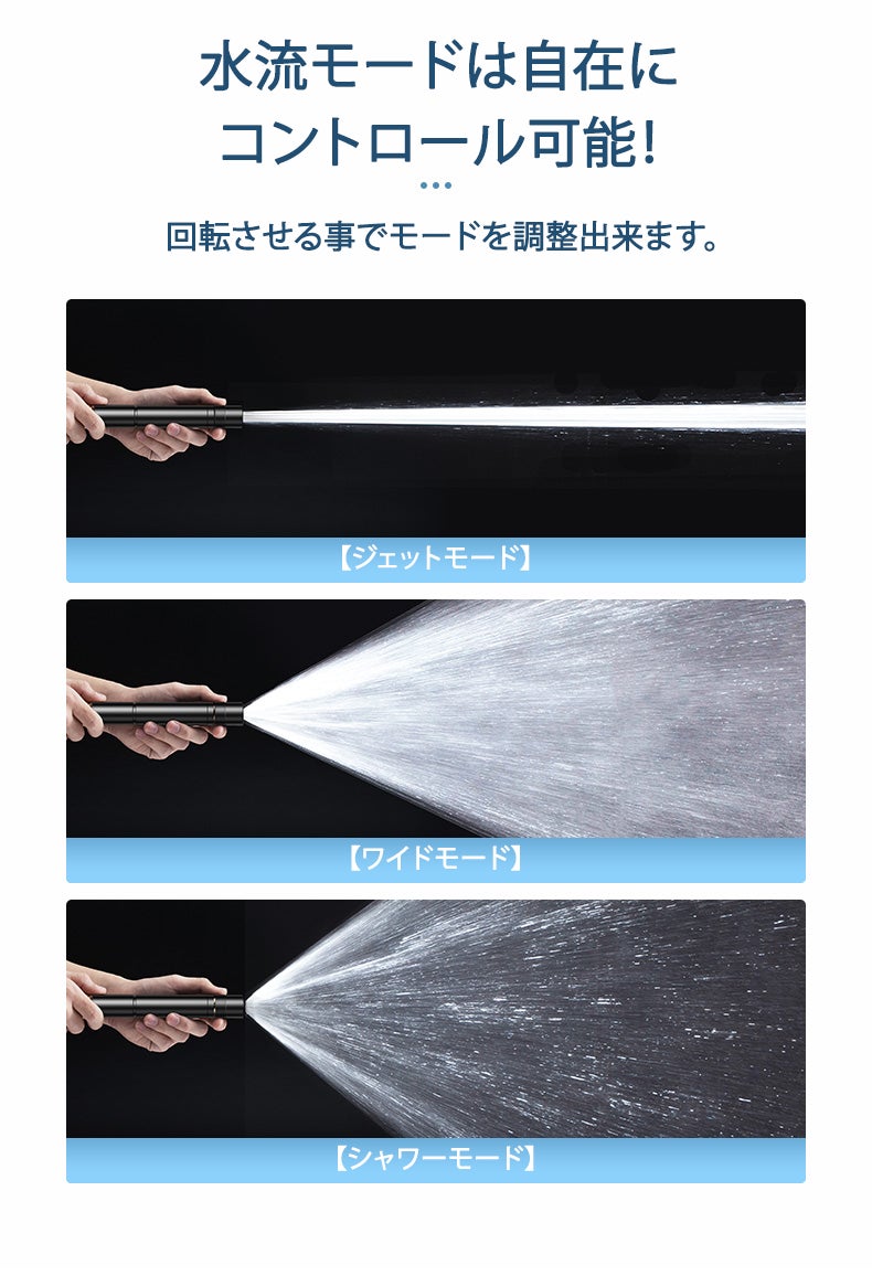 先端を回すだけで調節でき、3モードを切り替え可能です。高さのある場所、、遠くの場所や、狭い場所や低い位置など幅広いシーンに役立てることができます。