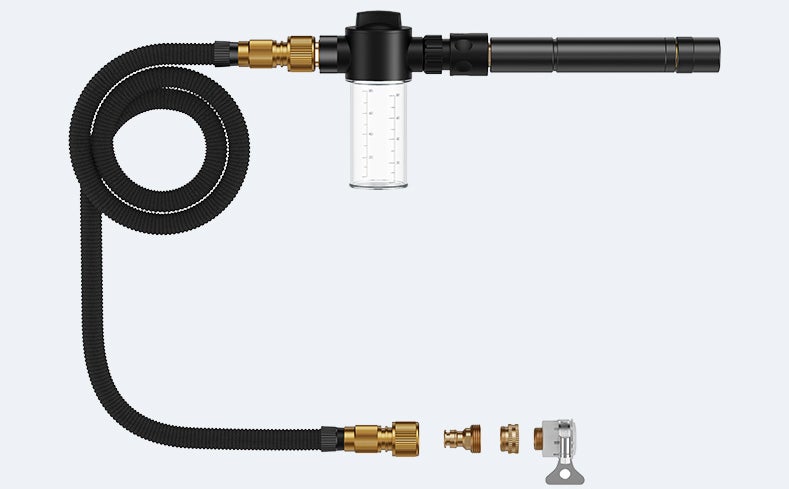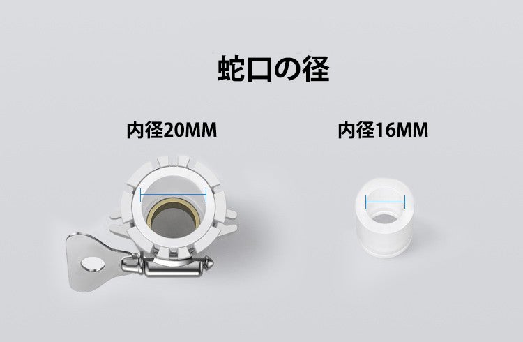 付属品:本体×1、ホース×1、メタルネジ付蛇口ニップル×1、ネジ取出しニップル×1、丸形水栓コネクター×1、車用のスポンジ×1、蛇口シールテープ×1、説明書×1。
