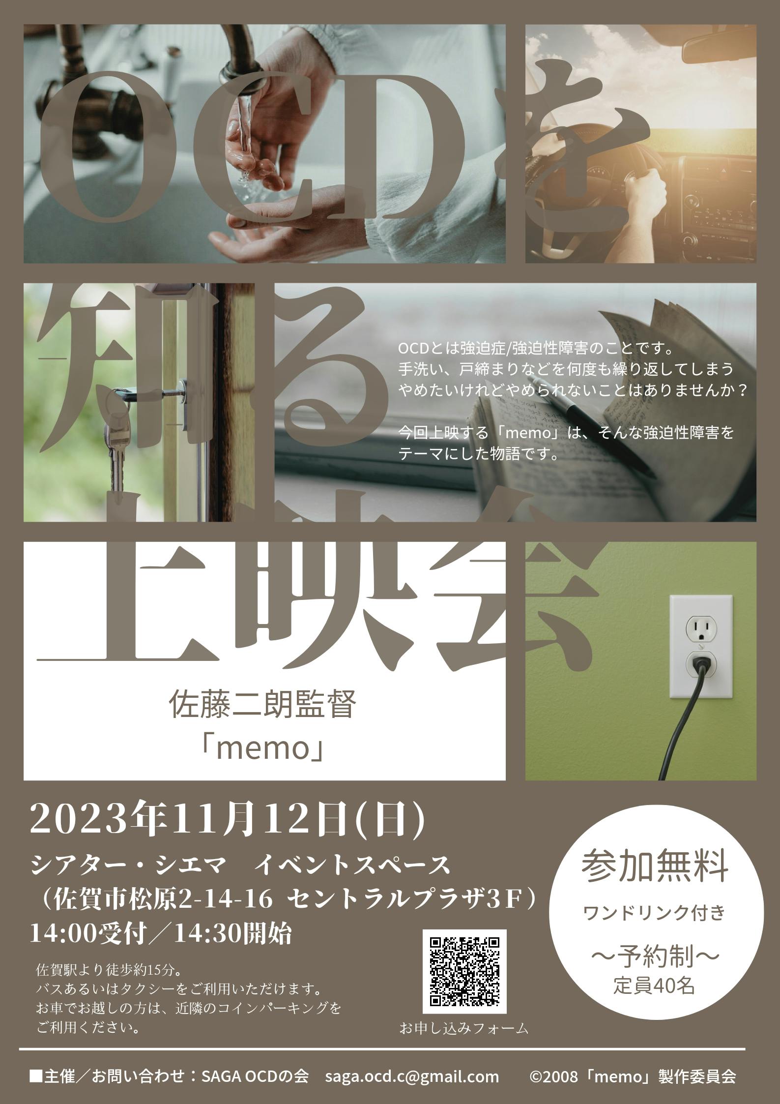 2023/05/31 19:43お世話になっております。本日は上映会の開催日と場所が決まりましたので、ご報告いたします。「OCDを知る上映会」開催日:2023.11/12(日)場所:シアター・シエマ イベントスペース(佐賀市)上映作品は佐藤二朗監督の「memo」です。他詳細や申し込み開始等、決定いたしましたら、またこちらにお知らせいたします。引き続き、何卒よろしくお願いいたします。SAGA OCDの会古川 幸佳 もっと見る