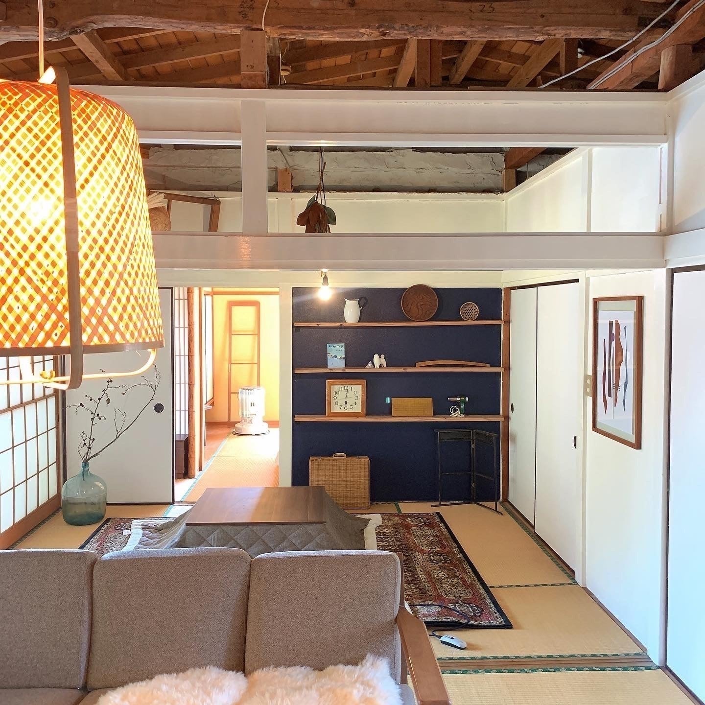 ここはセルフリノベーションで一人で天井を壊し壁を塗装。一部畳を取り足場板で施工しました。