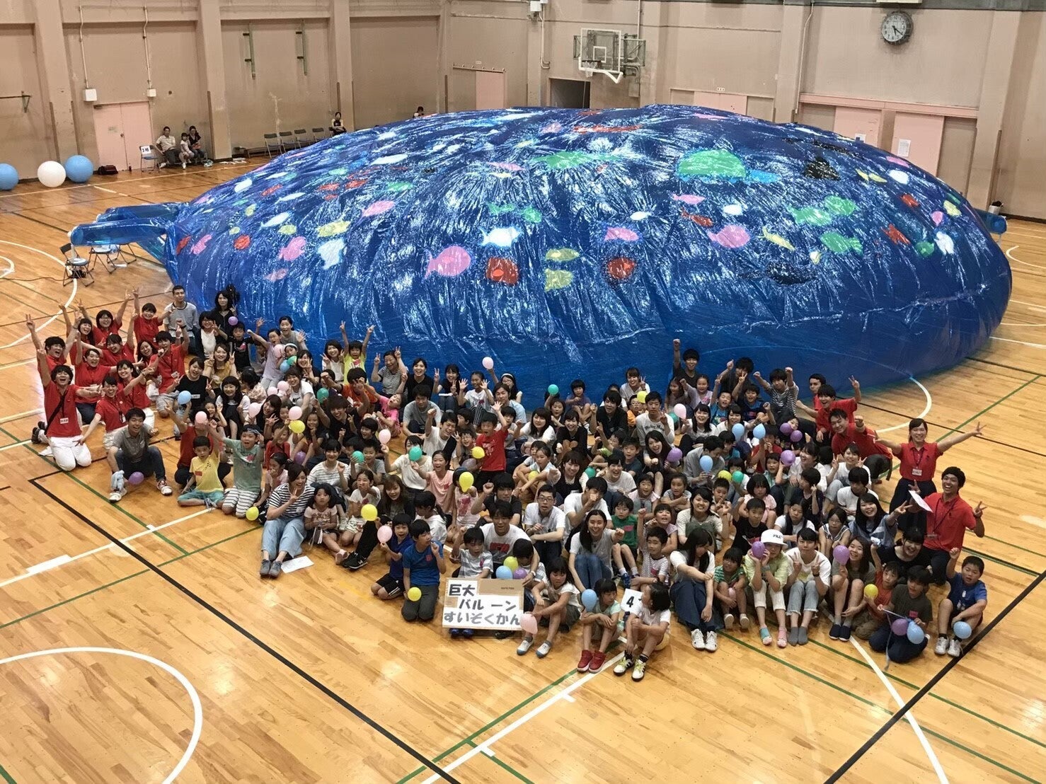 こどもたちが作った海の生物を貼り付けたバルーンを膨らませ、巨大な水族館をつくる挑戦!
