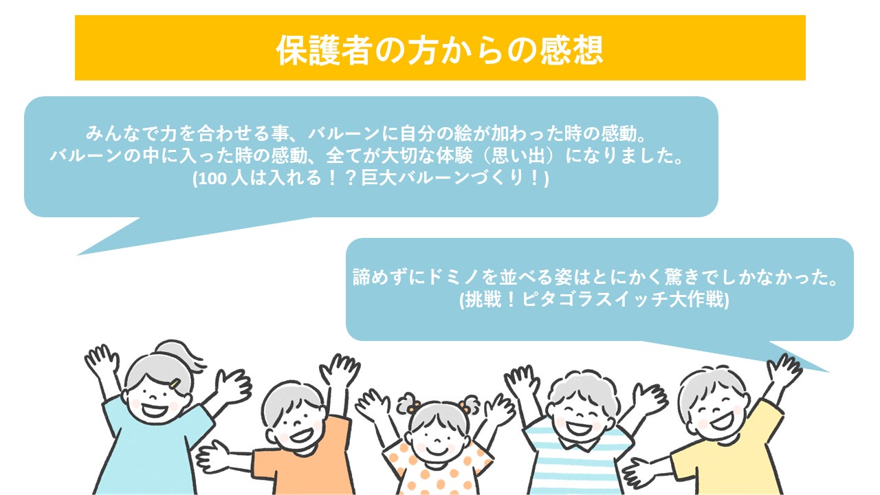 しかし、それらの「スキ」にチャレンジすることができるこどもはどれくらいいるのでしょうか。「スキ」にチャレンジしようとするとき、不安や恐怖が伴い、挑戦したくても一歩踏み出せない子どもたちが多いように感じます。これは、こども自身が、「自分にだってできる!」と勇気をだすこと。そして社会が、こども達を勉強や運動といった特定の尺度を評価するのではなく、その子自身の良さを大切にすることで、より多くのこどもたちが自分の「スキ」にチャレンジできるようになると考えます。たくさんのこどもたちが自分の「スキ」に挑戦し、それを友達や周りの大人たちが応援する社会はきっと素晴らしいものになると信じて、私たちは活動しています。