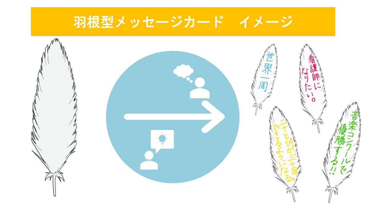 ●縦約9㎝、横約3㎝の羽根型メッセージカードに、”夢”や”挑戦”を記入していただきます。