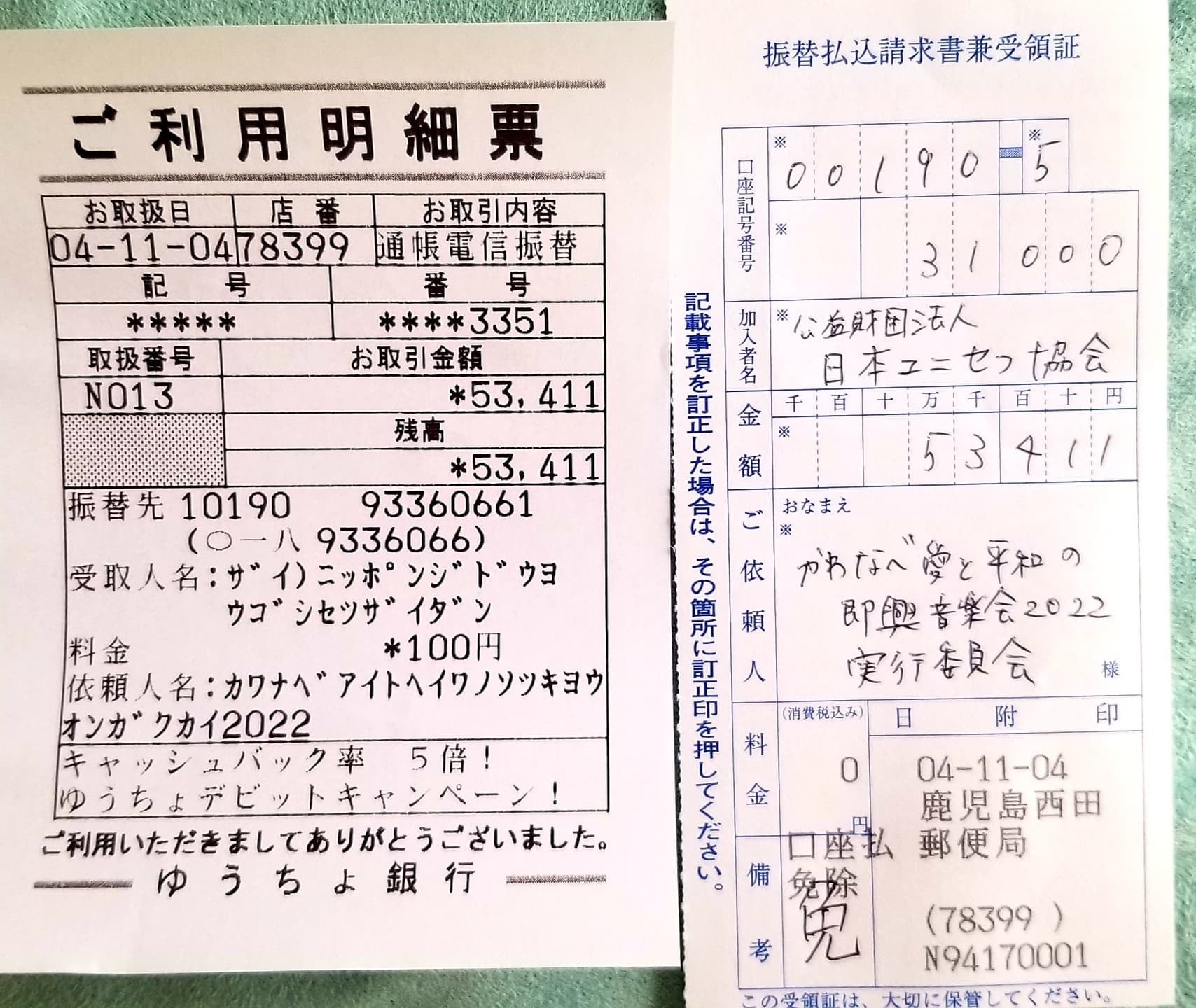 •  皆様のご協力とご支援により9/25に南九州市川辺町高田の石切場で行われた「かわなべ愛と平和の即興音楽会2022」、10月末にクラウドファンドから入金があり、経費最終精算、余剰金を全額、世界の愛と平和のために寄付し、当プロジェクトを終了しましたことを報告いたします。=収入=広告協賛金 200,000円イベント参加費 500円×69名=34,500円VR動画当日申込 500円×6名=3,000円当日協賛金 2,000円クラウドファンド支援金 217,071円-------------------------------------------収入計 456,571円=支出=ゲストアーティスト謝金 30,000円当日スタッフ日当5,000円×3人=15,000円撮影カメラマン謝金 10,000円演出構成費 10,000円実行委員手当8,000円×5名=40,000円スタッフ交通費 6,000円病欠スタッフ見舞金 10,000円弁当代 9,978円実行委員東京往復飛行機宿泊代30,000円事務雑品購入 22,791円VR撮影編集費 80,000円企画制作費 60,000円チラシプログラム制作費 10,000円楽器レンタル費 10,000円会計労務費 5,000円愛の寄付「日本児童養護施設財団」へ 53,411円平和の寄付「ユニセフ ウクライナ緊急募金」53,411円振込手数料 980円-----------------------------------支出計 456,571円収入計 456,571円-支出計 456,571円=0円【我々は微力だけど無力ではない。】ご協力ご支援まことにありがとうございました。また音でつながる輪(和)の力で、世界が愛と平和に包まれますように。2022年11月5日プロジェクトマネージャー もりぶー(森田孝一郎) もっと見る