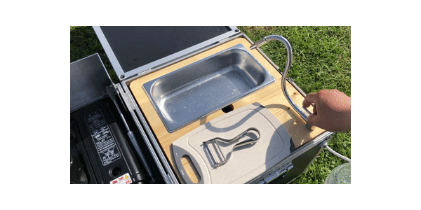 上水システム付きなので、タンクやペットボトルにホースを繋げるだけで水が出る。