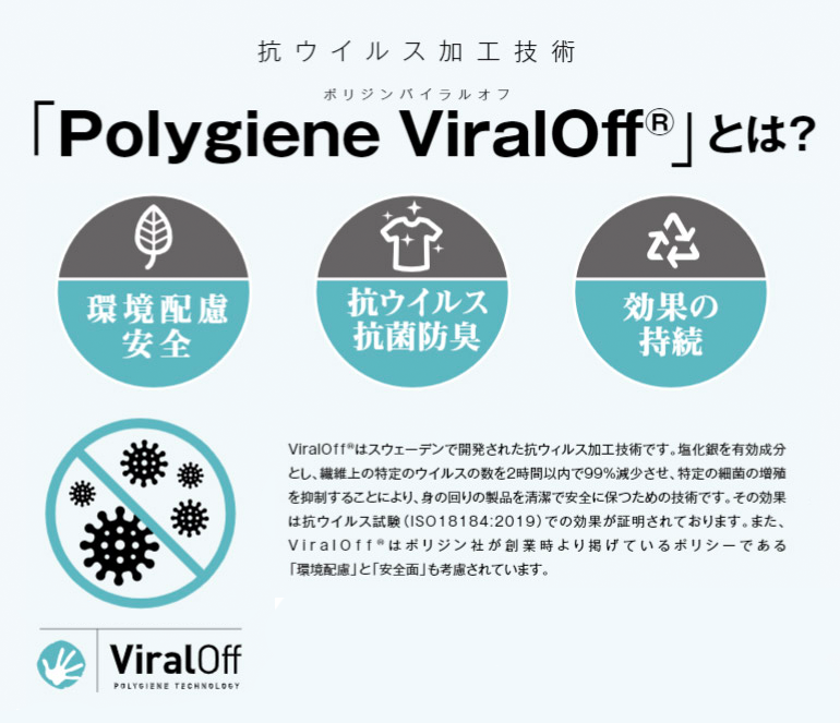 ※抗ウイルス+抗菌防臭は、ViralOff®生地の特性であり、製品そのものの効果ではありません。※「ViralOff®」は、株式会社ポリジンの登録商標です。※「ViralOff® 」加工をした生地の一般的な説明です。この製品そのものでの試験は実施しておりません。