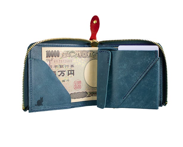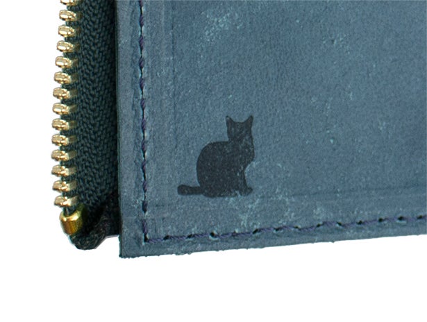 ファスナーの引き手は魚をモチーフにしており、財布の内部にはネコのシルエットが刻印されています。美しい物語の始まりのような、そんな想像が膨らむデザインになっています。