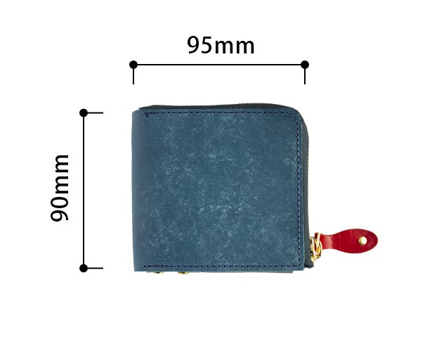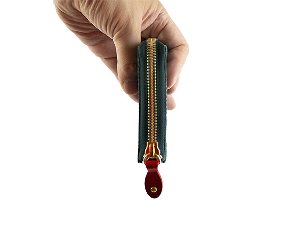 革は、工業製品のようにまっすぐ平らであったり直角だったりしません。とくに何も収納していない状況では革は歪む場合がございます。カード20枚を収納し、小銭やお札を入れてファスナーを閉めて、実際に使用する状況を想定してデザインしています。