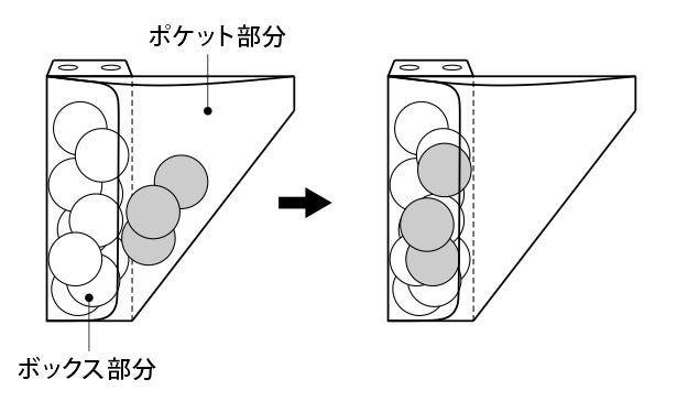 ※コインの枚数が満杯に近くなると、ボックス部分からあふれてポケットの途中でコインが収まることがあり、一時的に財布がふくらむことがありますが、そのままファスナーを閉めて、軽く振るか、持ち歩いているうちに自然な形でボックス部分の凹みに収まっていく仕組みです。