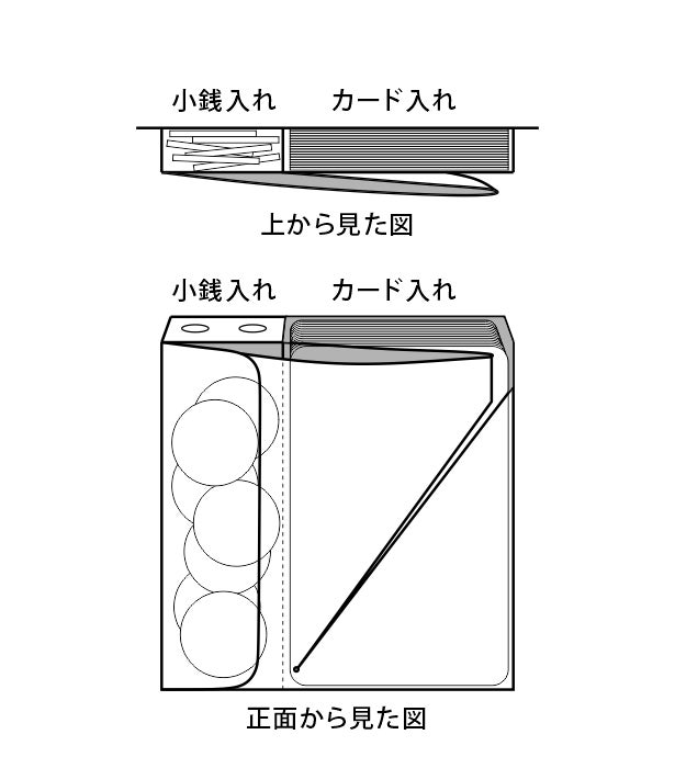 2. カード20枚 小銭20枚 お札10枚収納の場合で約26mmになります。カード入れと小銭入れを重ねないことで厚みを抑えています。