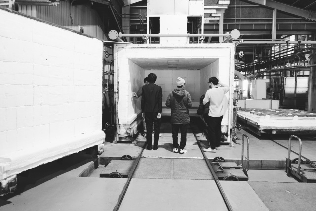 ↑ 丸朝製陶所のシャトル窯。台車の上で窯詰めを行い、移動式の台車ごと窯の中へ陶磁器を入れます。
