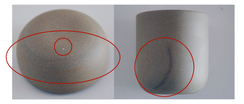 土を高温で焼き締めた際に起こる化学反応で写真のような色の変化(主に、黒、オレンジ、白)が現れる場合があります。