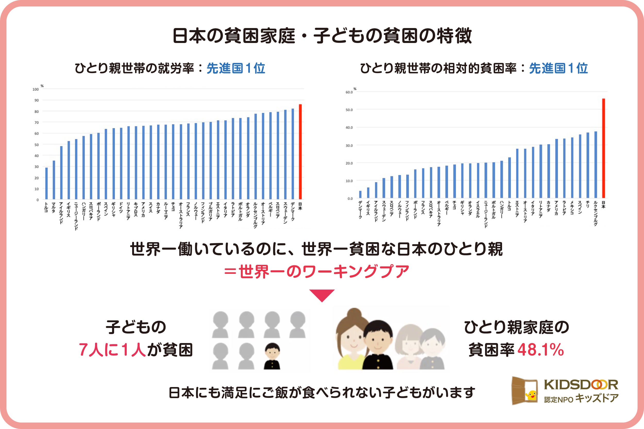 日本の子どもの7人に1人が貧困状態であるということを聞いたことがあるかもしれませんが、特に「ひとり親家庭の貧困率」は48.1%で、実にひとり親の2人に1人が貧困となっており、これは先進国で最低水準にあります。母子世帯の就業率は国際的にみても高い水準であるにもかかわらず、非正規就業や低賃金などにより所得が上がらず、世界一働いているのに、世界一貧困=世界一ワーキングプアな国となっているのが現状です。