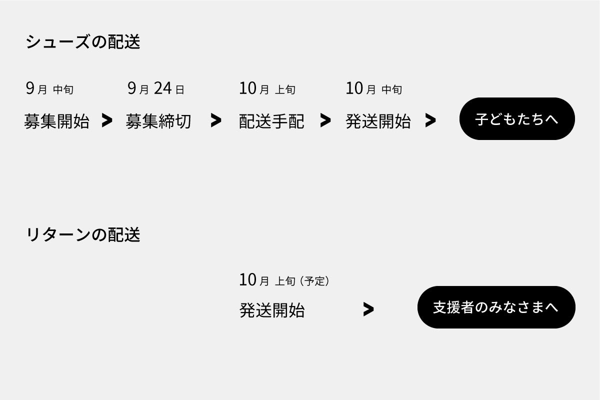 キッズドアファミリーサポートに登録している困窮子育て家庭のうち、東京都内で暮らす約4,800名の子どもたちに対して希望を募り、その中から選定させていただいた子どもたちに337足のシューズをお届けします。