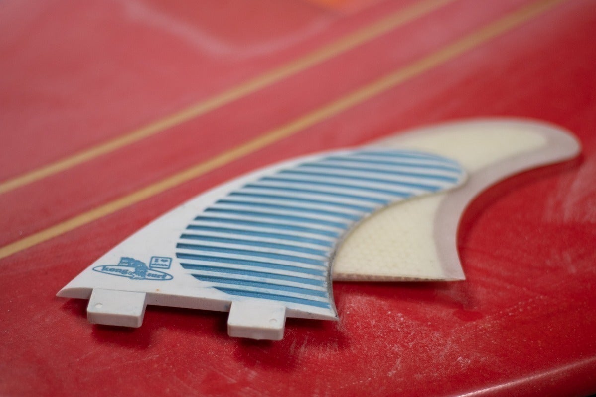 フォームの削り出しに立ち会い、ノーズやテールの形、ロッカーについて自分のサーフィンのイメージを元に相談に乗ってもらいました。ティントカラーもブルーにグリーンを混ぜ、くすんだ感じを出すためにスモークを加えました。納得いくまで色の配合を調整し繰り返し試し塗りをしていただいたおかげで理想のカラーに仕上がりました。重ためにしたかったので、両面ボランクロス巻きにデッキパッチも加え、理想のログに仕上がりました。