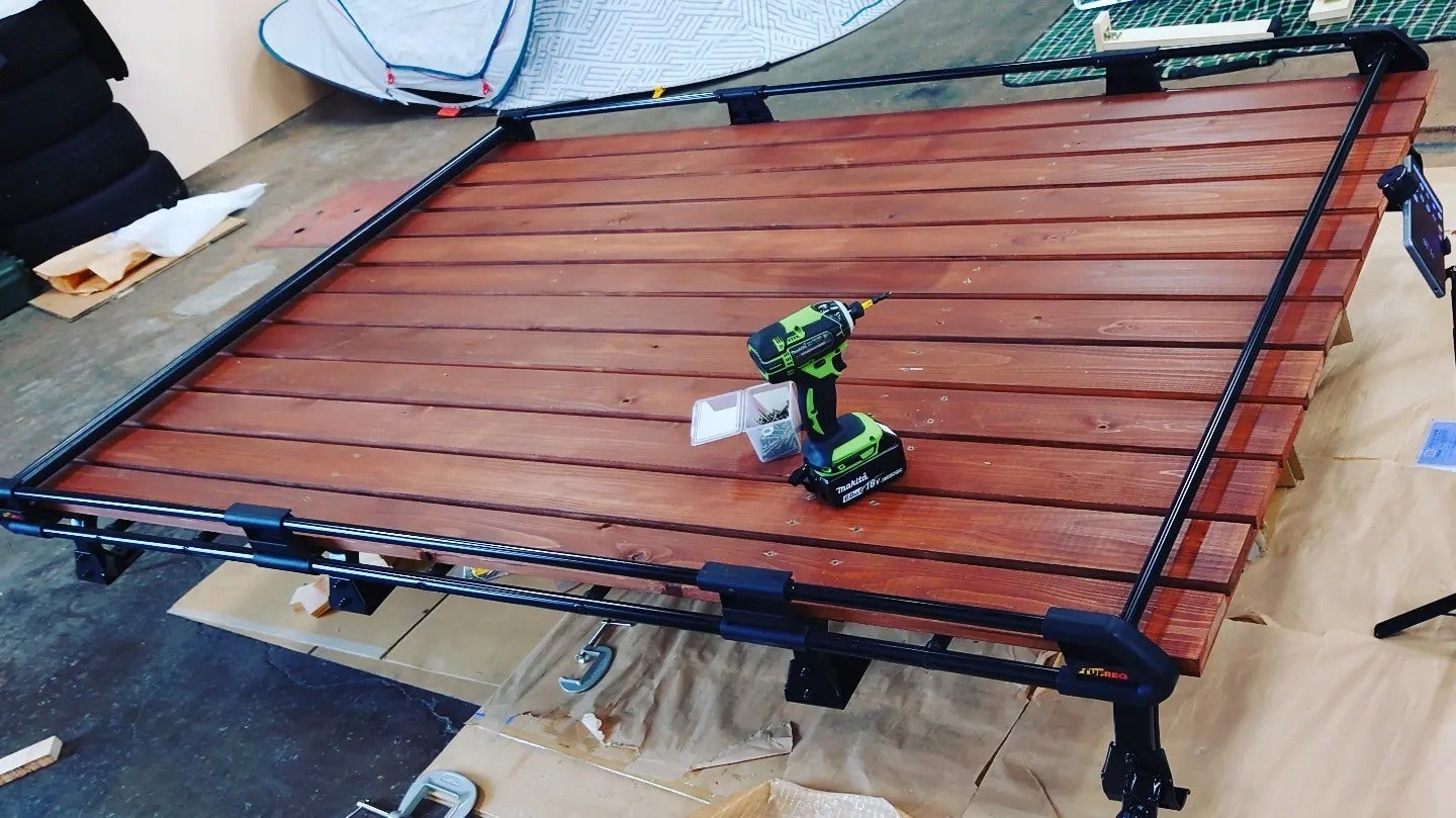 電気自動車のキャンピングカーをDIYで制作しているプロジェクト、『NORRA RÄVEN(ノーララーベン)』です。現在、全塗装のため車を3〜4週間預けています。その間に車がなくても進められる作業をやっておこう!ということで、ルーフキャリアを組み上げて、その上にウッドデッキを張ってみました。木材は軽くて水に強い檜をチョイス。3度塗りで塗装し、キャリアに取り付けてみました!このルーフキャリアには、もう一つとっておきの仕掛けを考え中。溶接が必要になりそうでちょっと専門家に相談中ですが、上手く行けばすごく素敵なオリジナル装備になりそうです!続報をお楽しみに!SNSなどでご興味のありそうなお友だちに拡散していただけると大変ありがたいです!引き続き、応援をよろしくお願いします!