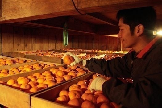 一定の温度・湿度が保たれた倉庫で貯蔵される青島みかん。
