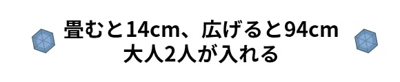 PS-3は折り畳むとわずか14cmですが、広げると94cmのたっぷりサイズで、大人2人が余裕で使用できます。突然の大雨などでも安心です。