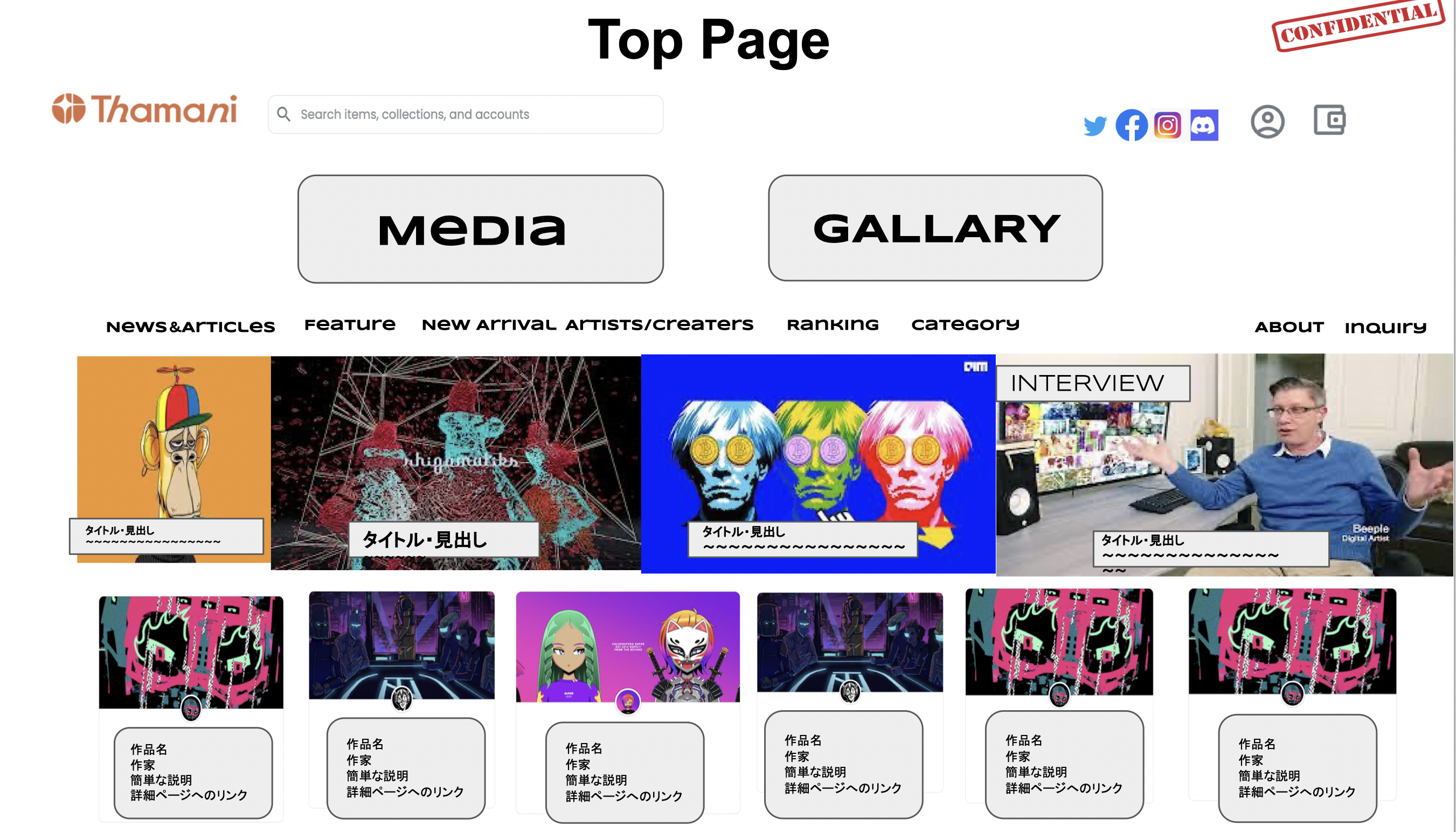 THAMANIのトップページのイメージです。プラットフォームのトップはMEDIAとGALLARYに分かれて構成され、メニューは「NEWS & ARTCLES」が最新ニュースと最新記事、「FEATURE」が特集記事、「ARTISTS/CERATERS」が作り手の紹介ページ、「RANKING」が人気作品のランキング、「ABOUT」がTHAMANIの概要説明、「INQUAIRY」が問い合わせ先になります。