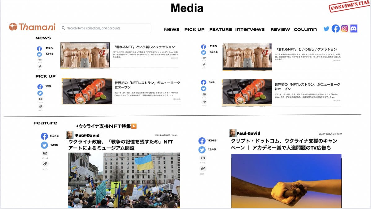「MEDIA」には最新ニュース記事のタイトル・リード文の一部、サムネイル画像があり、左にSNSのリツートやシェアなどの数字に加えて閲覧数が掲示されます。さらに記事には投げ銭機能をつけ、クレジットカード決済を可能にします。投げ銭機能をつけることでライターやジャーナリストが収入を得ることができ、SNSの反響が視覚化されることで記事を書くモチベーションにつながるからです。