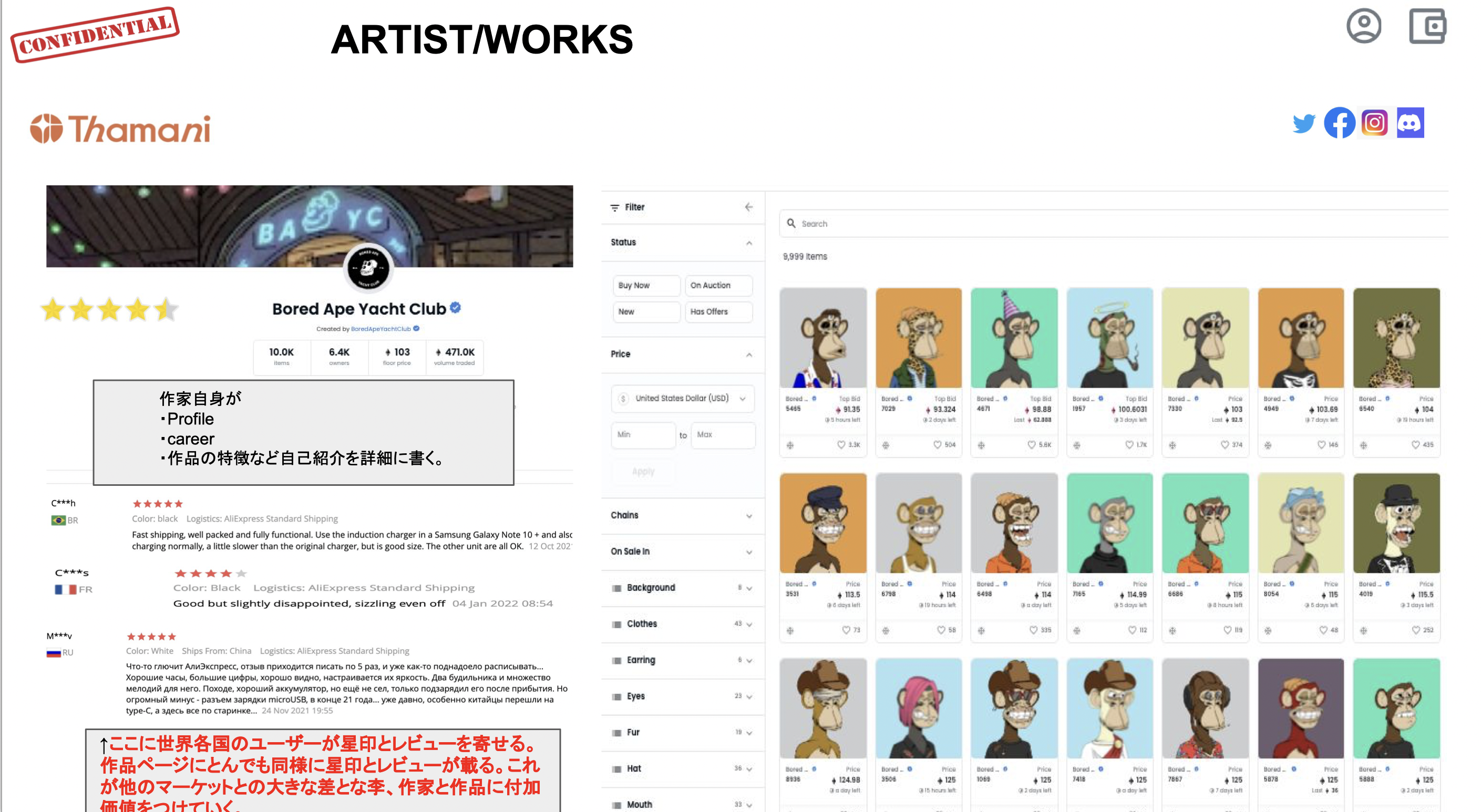 2. クリエイター/アーティストのプロフィールを充実させ、ユーザーによるレビューや★マークの第三者による評価で、一般の人でもわかりやすく、感覚的に操作できるプラットフォームとNFTの世界をつくる。
