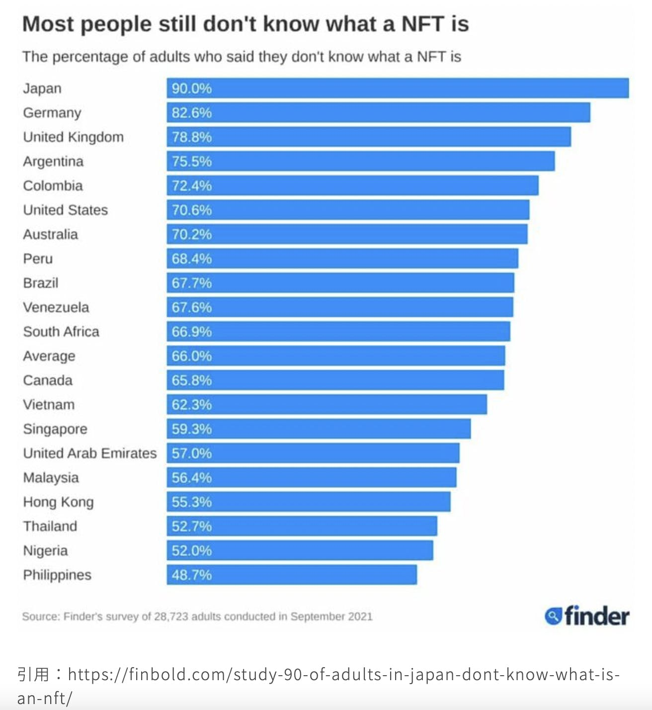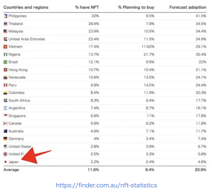 2021年9月に実施されたNFTに関するアンケートで20カ国28,000人以上が「NTFを知っている」と投票、日本人の90%がNFTが何であるかを知らないという結果が出ています。世界一NFTを知らない国が日本なのです。「NFTを知らない」と答えた成人の割合が最も多いのは日本(90%)、次いでドイツ(83%)、イギリス(70%)。また、アメリカでも70.6%の成人がNFTを知らないと回答しています。アメリカではNFTが盛んだと思っていたので意外な数字です。一方、フィリピン(49%)、ナイジェリア(52%)、タイ(53%)はNFTとは何かが分かっている人が多いことにも注目です。おそらくゲームで暗号資産を稼ぐことが流行った影響かと思います。フィリピン人の51%がNFTを認知しておりそのうち32%がNFTを所有しています。一方、日本の成人ではNFTを認知している人は10%でそのうち2%しかNFTを所有していません。