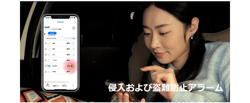 Cam.G PLUS本体と専用アプリ(本体とペアリングしているデバイス)から同時にアラームが鳴り、侵入者から身を守ることができます。また、貴重品などの盗難防止にも役立ちます。